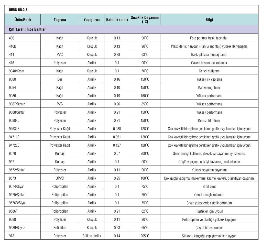 Çift taraflı bantlar, birçok farklı endüstriyel uygulamalar, esnaf ve zanaatkârlar ve tüketiciler tarafından kullanılmaktadır. İki parçanın kalıcı olarak ve kesin şekilde birleştirilmesi, hala yerleri değiştirilebiliyorken parçaların yapıştırılması veya sınırlı bir zaman için nesneleri basit şekilde tutturmak için çift taraflı bantlar mükemmel çözümlerdir. Bir bant içinde kullanılan bileşenlere bağlı olarak bandın özel uygulamalara uygun olmasını sağlayan belirgin özellikler sunmaktadır. Yapışkan bandı oluşturan yapıştırıcıların, dolguların, primerlerin türü özelliklerini tanımlamaktadır ve bir uygulamanın gereksinimlerine göre mükemmel şekilde ayarlanabilmektedir.