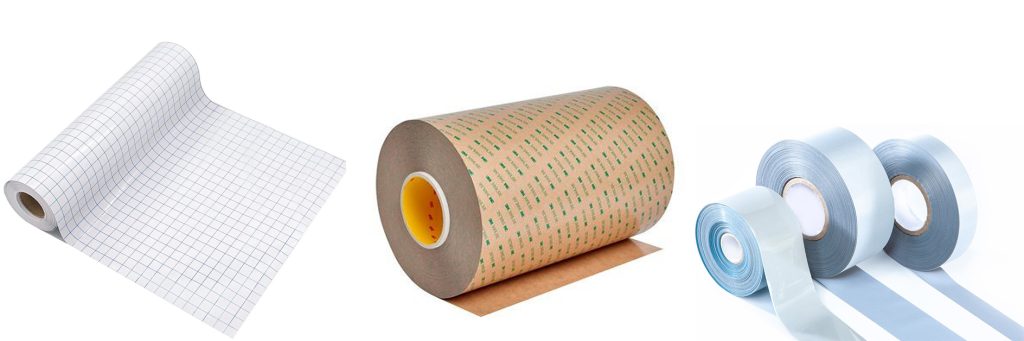 Serbest bırakma astarları, belirli ihtiyaçlarınızı karşılamak için farklı ağırlıklarda geniş bir kağıt ve film seçenekleri ile gelir. Transfer bant genellikle ince veya esnek malzemeleri birleştirirken kullanılır çünkü 0.002 inç veya daha az kalınlıklarda kaplanabilirler ve önemli ölçüde boyutsal kararlılık kazanmazlar. Tasarımları aynı zamanda daha yüksek sıcaklık direncine olanak tanır. Yapışkan transfer bantlarında yapışkan kaplama ağırlıkları uygulamaya bağlı olarak arttırılmış dayanıklılık veya yapışkanlık için özelleştirilebilir, bant herhangi bir şekil veya boyutta kesilebilir. Yapışkan transfer bant seçenekleri şunları içerir: